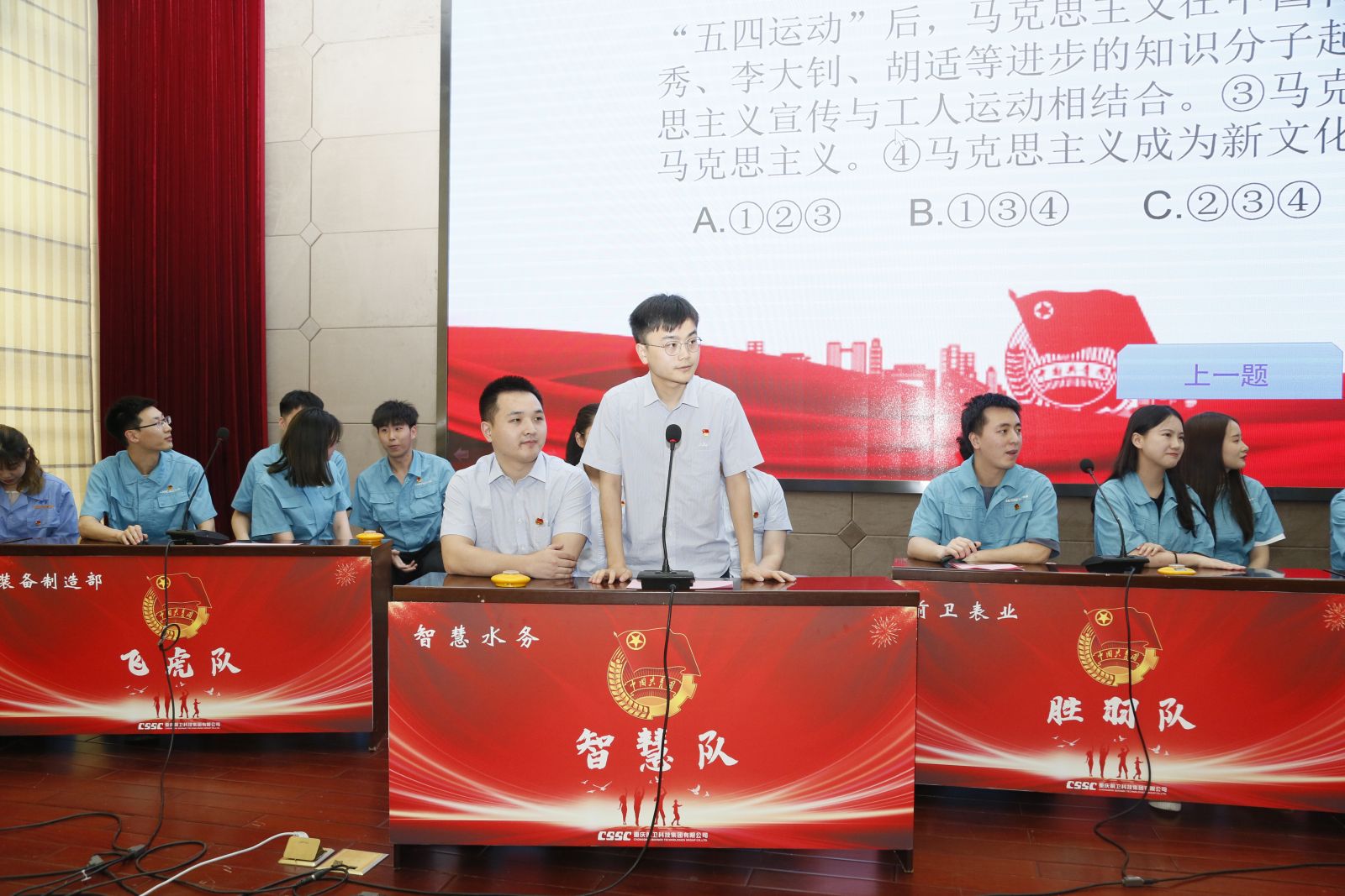 表彰會后,慶祝建團百年知識競賽火熱展開。來自各基層團組織的8支隊伍同場競技。最終,前衛(wèi)無線&工程事業(yè)部(聯(lián)隊)獲得一等獎,技術(shù)中心、職能部門獲得二等獎,前衛(wèi)表業(yè)、智慧水務(wù)、科凱前衛(wèi)獲得三等獎。